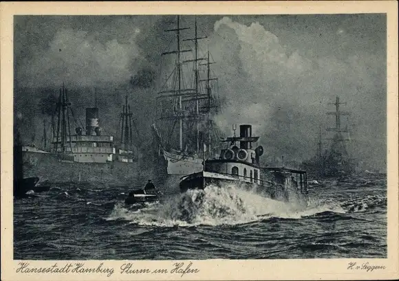 Ak Hamburg, Sturm im Hafen, Dampfschiff, Segelschiffe