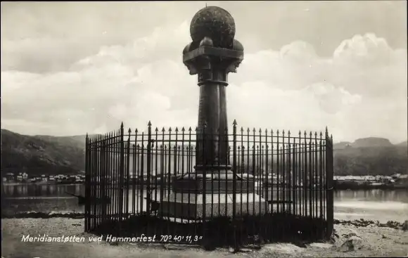 Ak Hammerfest Norwegen, Meridianstotten, Meridianmonument, Messpunkt, Umgebung