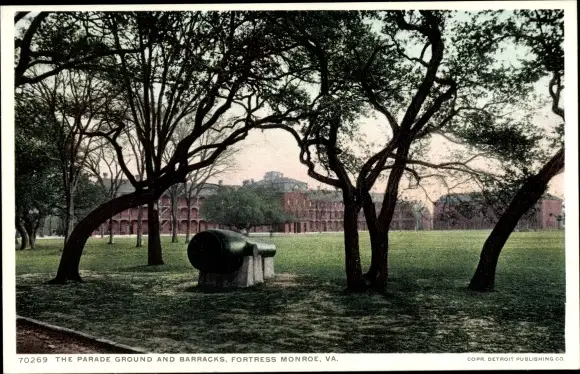 Ak Hampton Virginia USA, Fort Monroe, Exerzierplatz, Kaserne