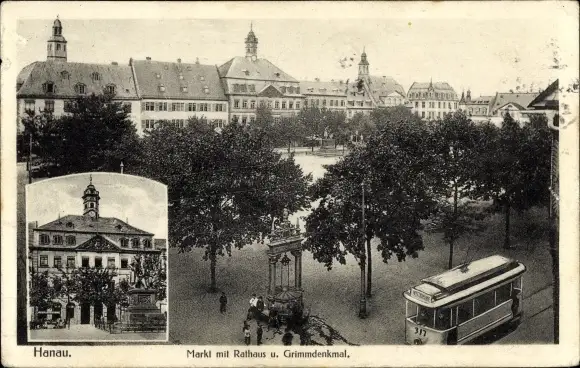 Ak Hanau am Main, Markt, Rathaus, Grimmdenkmal, Straßenbahn