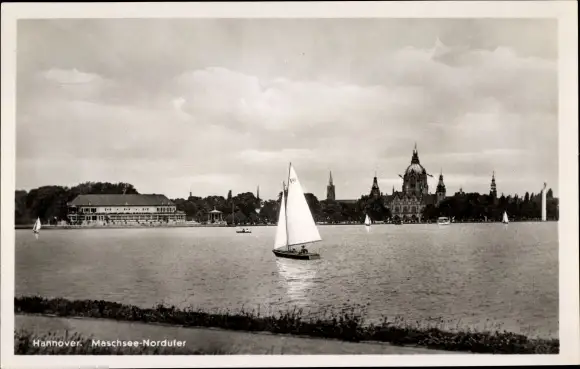 Ak Hannover in Niedersachsen, Maschsee-Nordufer, Segelboot, Panorama