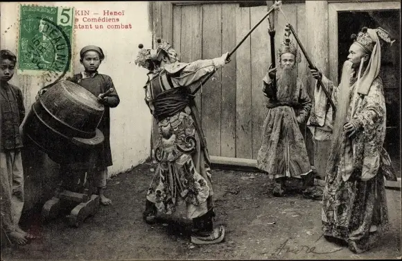 Ak Hanoi Tonkin Vietnam, Groupe de Comediens, scene representant un combat