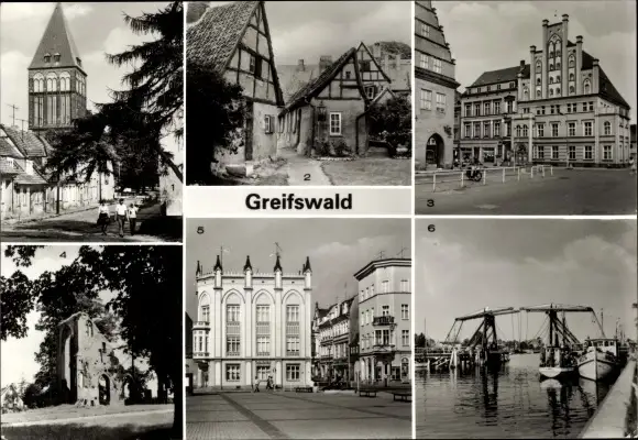 Ak Hansestadt Greifswald, Jakobikirche, Domstraße, St. Spiritus, Fischmarkt, Klosterruine Eldena