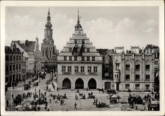 Ak Hansestadt Greifswald, Rathaus, Giebelhaus, Passanten, Kirchturm