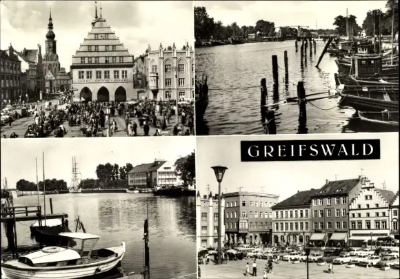 Ak Hansestadt Greifswald, Rathaus und Nicolaikirche, Fischereihafen, Seesportschule