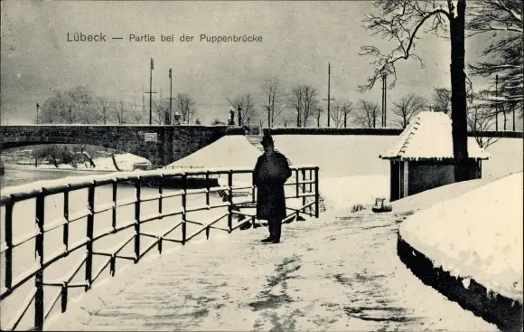 Ak Hansestadt Lübeck, Bei der Puppenbrücke, Winteransicht