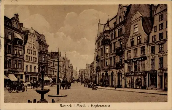 Ak Hansestadt Rostock, Hopfenmarkt, Geschäftshäuser, Automobile Benz