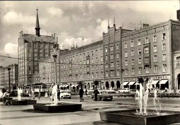 Ak Hansestadt Rostock, Lange Straße, Springbrunnen, Straßenbahn