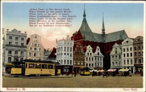 Ak Hansestadt Rostock, Neuer Markt, Straßenbahn, Marienkirche, Söben Toern