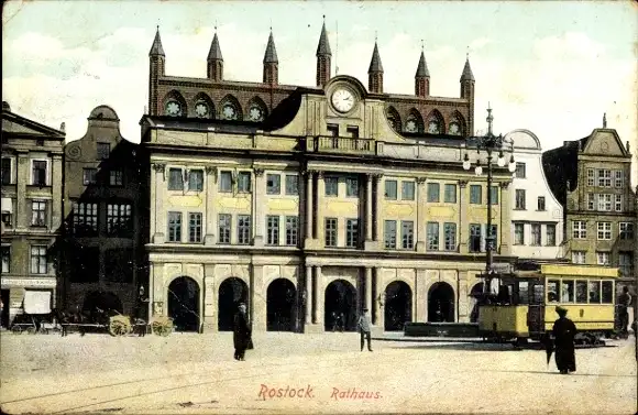 Ak Hansestadt Rostock, Rathaus, Straßenbahn, Uhr