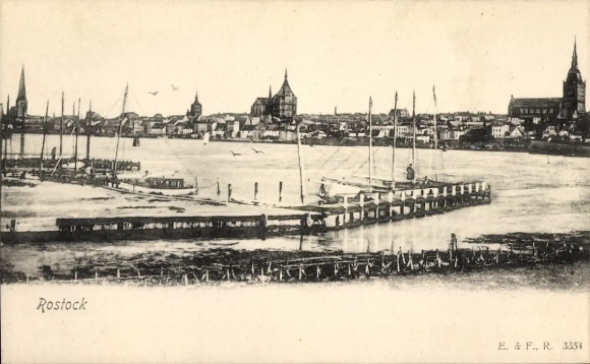 Ak Hansestadt Rostock, Schwarze und weiße Ansicht von Hafen, Boote, Stadtansicht