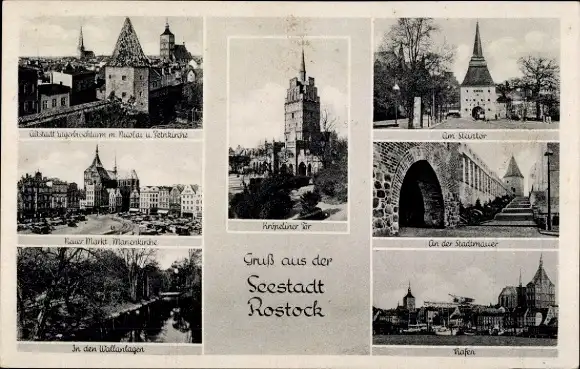 Ak Hansestadt Rostock, Stadtansichten, Innenstadt, Marienkirche, Stadtmauer, Wasserturm