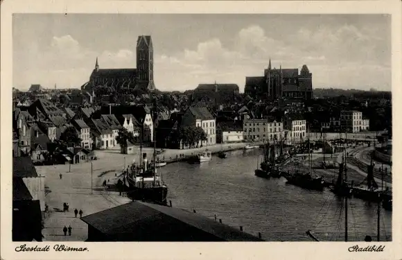 Ak Hansestadt Wismar, Gesamtansicht, Hafen