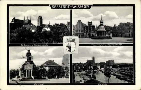 Ak Hansestadt Wismar, St. Georgen und St. Marienkirche, Wasserkunst, Ehrenmal, Wappen