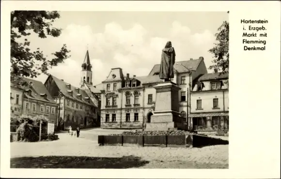 Ak Hartenstein im Erzgebirge, Markt mit Flemming Denkmal