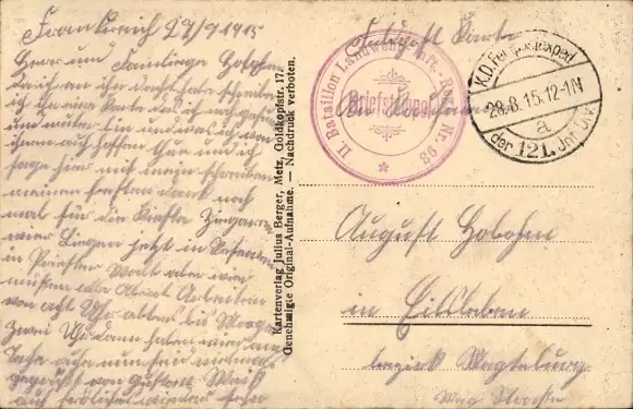 Zustand, siehe Scan, gelaufen, 1915 - ca 14 cm X 9 cm