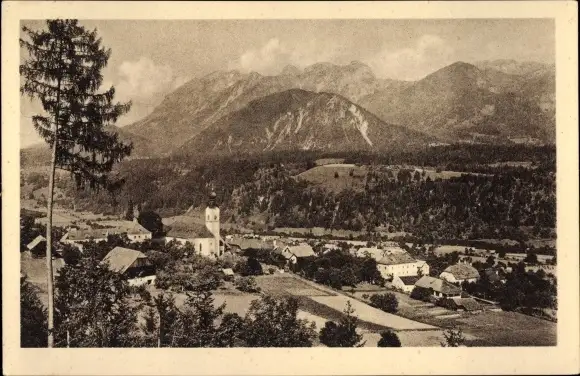 Ak Haus Steiermark, Totalansicht der Ortschaft mit Dachsteingruppe