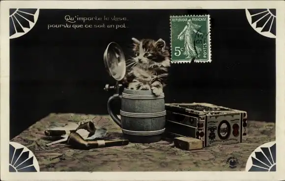 Ak Hauskatze in einem Bierkrug, Zigarren