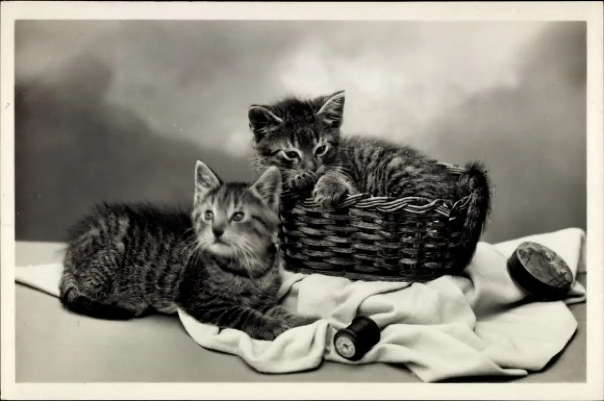 Ak Hauskatzen mit Garnrolle und Weidenkorb