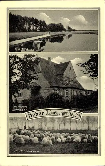 Ak Heber Schneverdingen in der Lüneburger Heide, Freibad, Pension Schröder, Heidschnucken