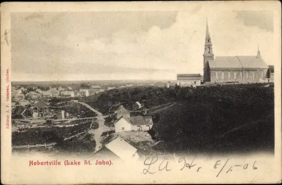 Ak Hébertville Québec Kanada, Lake St. John, Ortsansicht, Kirche