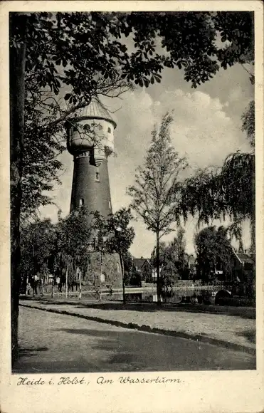 Ak Heide in Holstein, Am Wasserturm, Bäume, Häuser