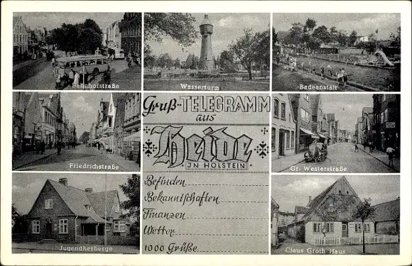 Ak Heide in Holstein, Wasserturm, Bahnhofstraße, Jugendherberge, Friedrichstraße