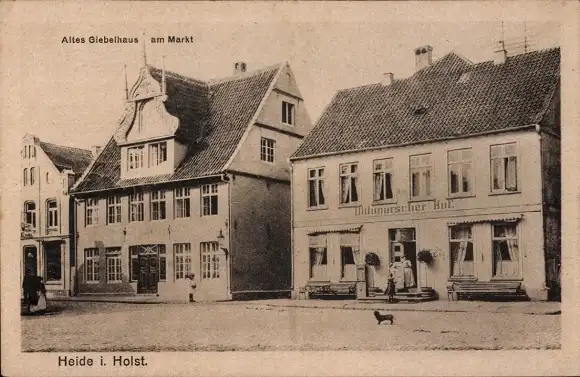 Ak Heide in Holstein, altes Giebelhaus am Markt, Dithmarscher Hof, Dackel