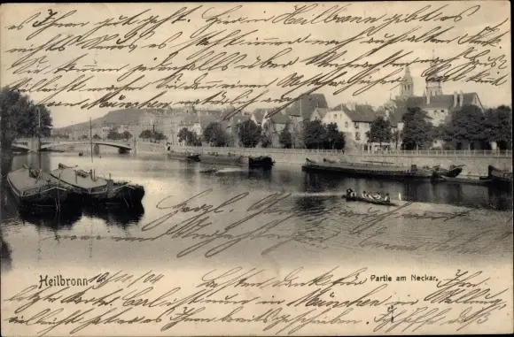 Ak Heilbronn am Neckar, Partie am Neckar, Schiff, Ruderboot, Kirche