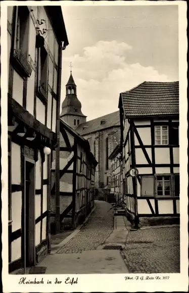 Ak Heimbach in der Eifel, Straßenansicht, Fachwerkhäuser, Kirchturm