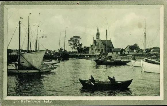 Ak Hel Hela Gdańsk Danzig, Hafenpartie mit Kirche und Ruderboot
