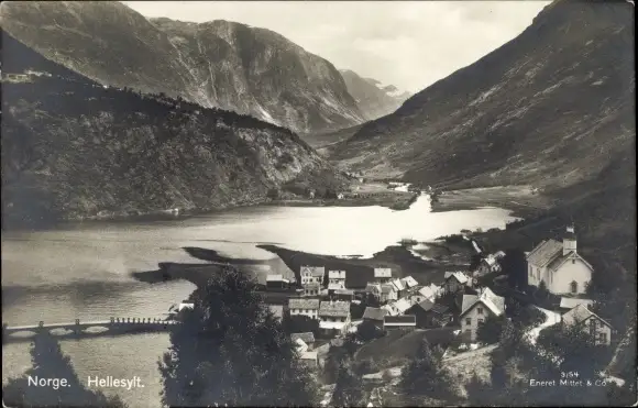Ak Hellesylt Norwegen, Totalansicht des Ortes, Fjord