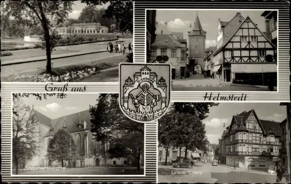 Ak Helmstedt in Niedersachsen, Quellenhof, Hausmannsturm, Lindenplatz, Stephanskirche, Wappen