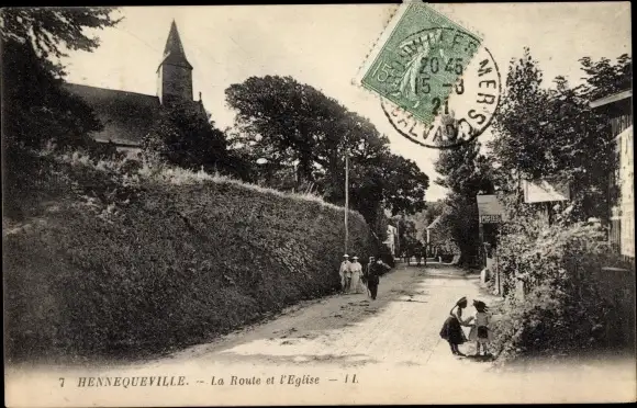Ak Hennequeville Calvados, La Route et l'Eglise