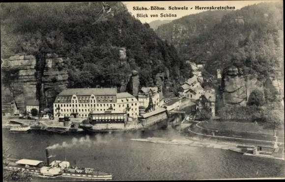 Ak Hřensko Herrnskretschen Elbe Region Aussig, Blick von Schöna, Dampfschiffe