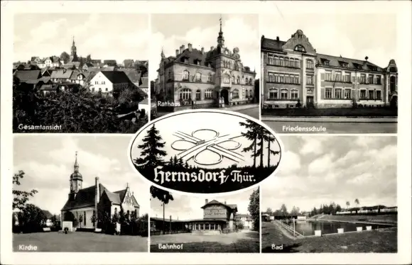 Ak Hermsdorf in Thüringen, Rathaus, Friedensschule, Kirche, Bahnhof, Bad