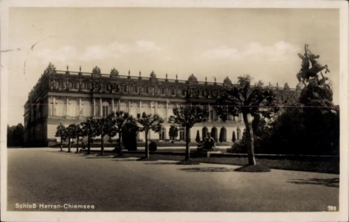 Ak Herrenchiemsee Herreninsel Chiemsee Oberbayern, Schloß Herren-Chiemsee, Statue, Bäume,