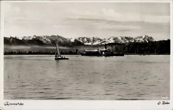 Ak Herrsching am Ammersee, Panorama, Segelboot