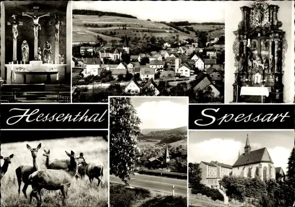 Ak Hessenthal Mespelbrunn im Spessart, Rotwild, Kirche, Panorama