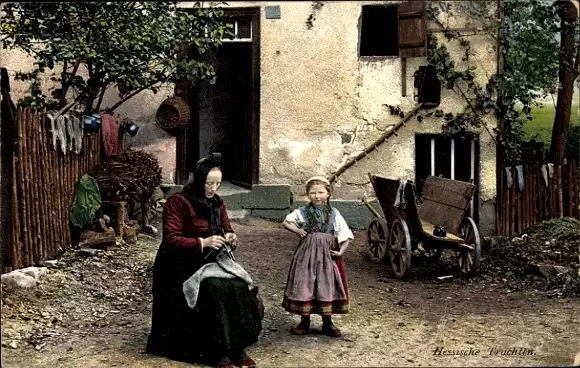 Ak Hessische Trachten, Mutter mit Kind, Stricken, Bauernhof
