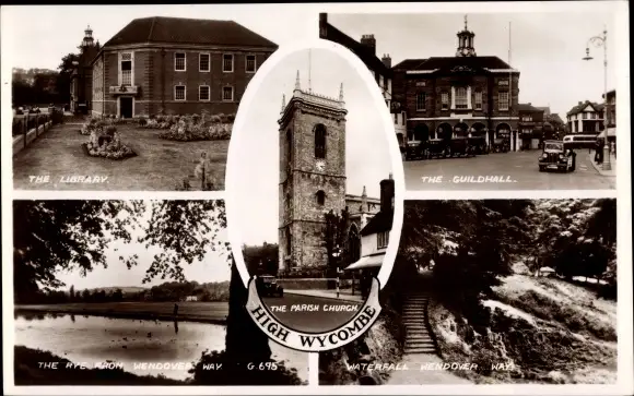 Ak High Wycombe Buckinghamshire, The Guildhall, The Library, Waterfall Wendover Way