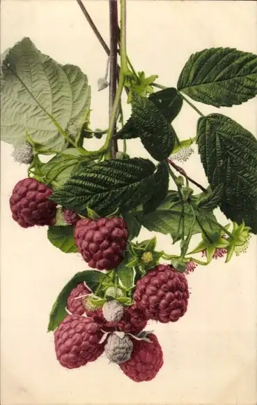 Ak Himbeere, Früchte, Blüte, Blätter, Stillleben