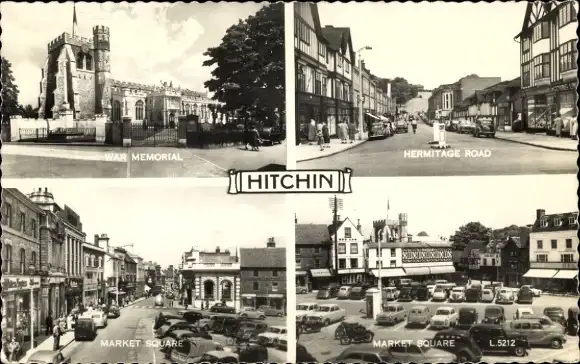 Ak Hitchin East England, Kriegsdenkmal, Hermitage Road, Marktplatz