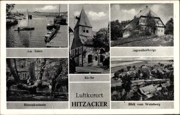 Ak Hitzacker an der Elbe, Kirche, Jugendherberge, Riesenkastanie, Hafen