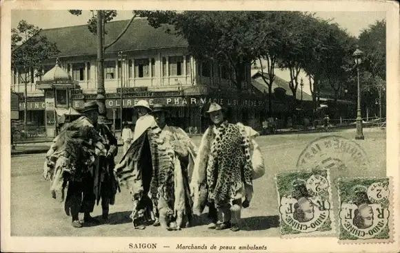 Ak Ho Chi Minh Stadt Saigon Vietnam, Fünf Händler mit Tierhäuten, Stadtansicht im Hintergrund