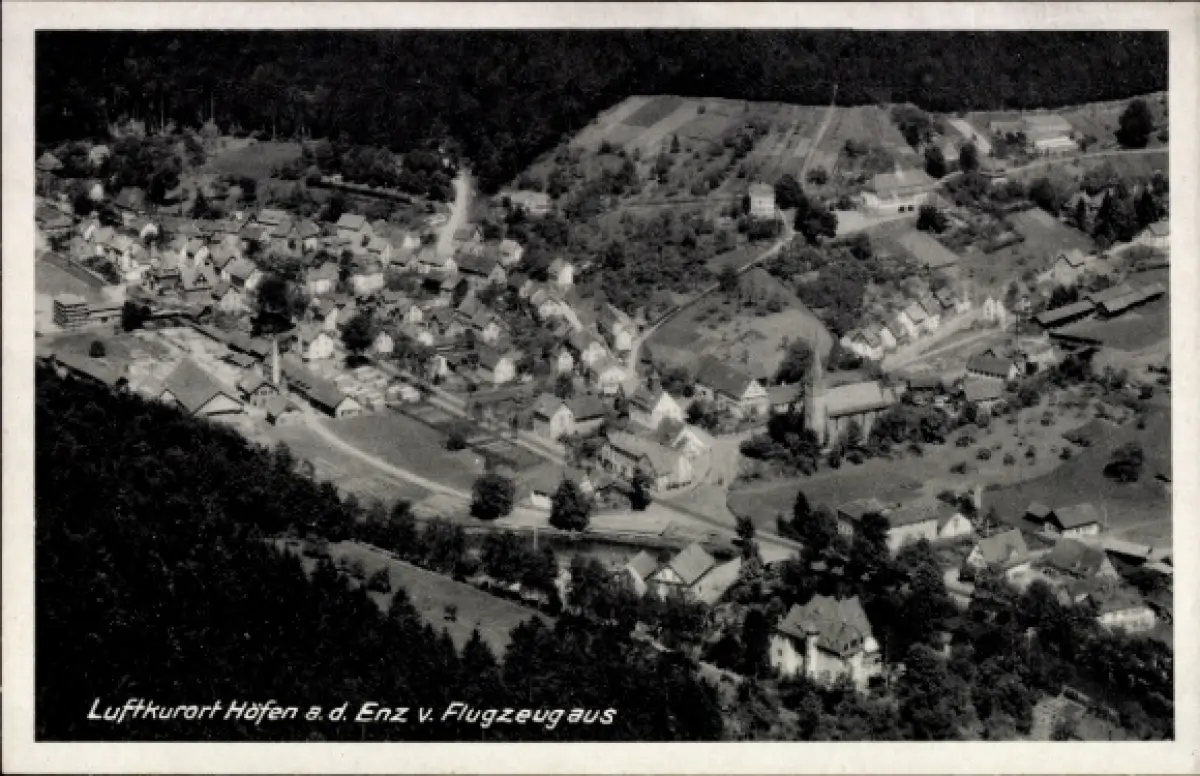 Ak Höfen an der Enz Schwarzwald, Luftkurort Höfen, Luftaufnahme, viele Häuser, Landschaft