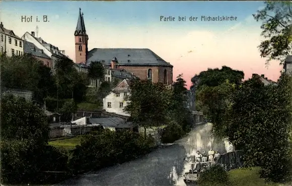 Ak Hof an der Saale Oberfranken Bayern, Michaelskirche, Fluss, Bäume, Häuser, sanfte Farben, F...