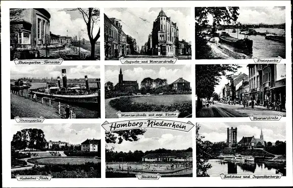 Ak Homberg Duisburg im Ruhrgebiet, Hubertus Platz, Bootshaus und Jugendherberge, Stadtbad, Kirche