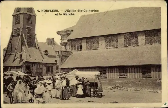 Ak Honfleur Calvados, Eglise Ste-Catherine, Markt, Menschenmenge, Architektur