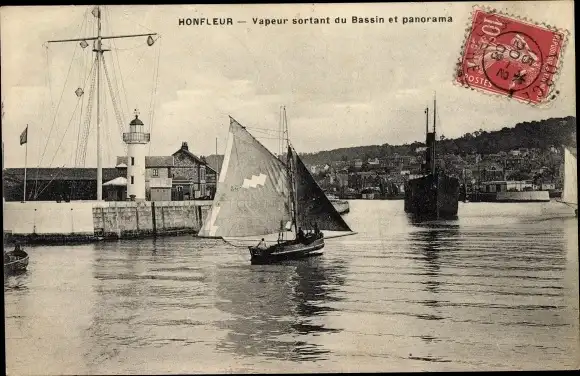 Ak Honfleur Calvados, Vapeur sortant du Bassin et panorama